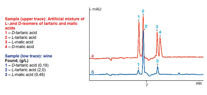The task has come from some European oenological labs and customs, where they have been meeting the increasing amount of falsified or technologically deviated wines. Sometimes it happens that for wine acidification unreliable wine producers use cheap racemic mixture of D-and L-isoforms instead of a pure L-isomer of tartaric acid, thus violating the strict prescription of International Organisation of Vine and Wine (OIV).